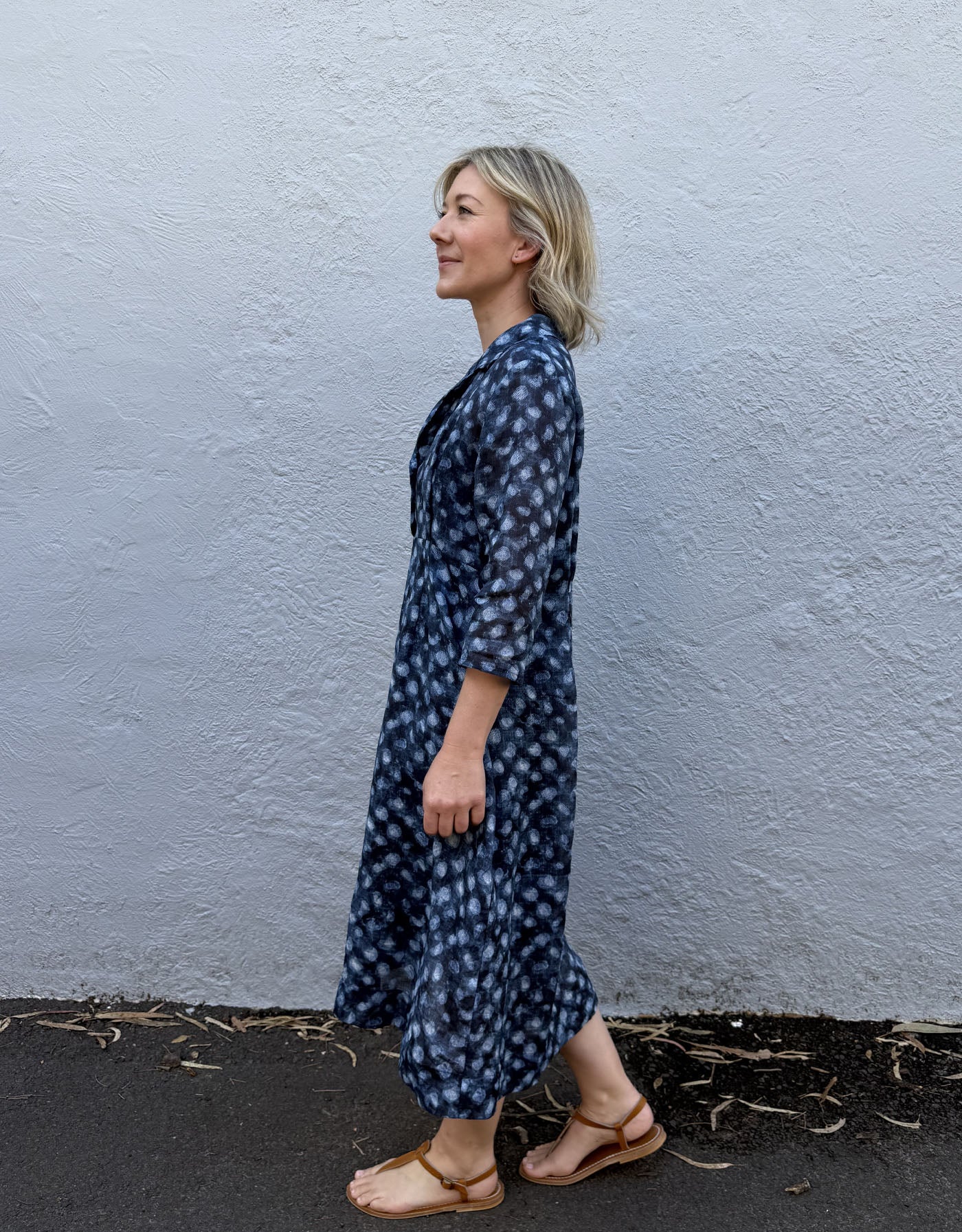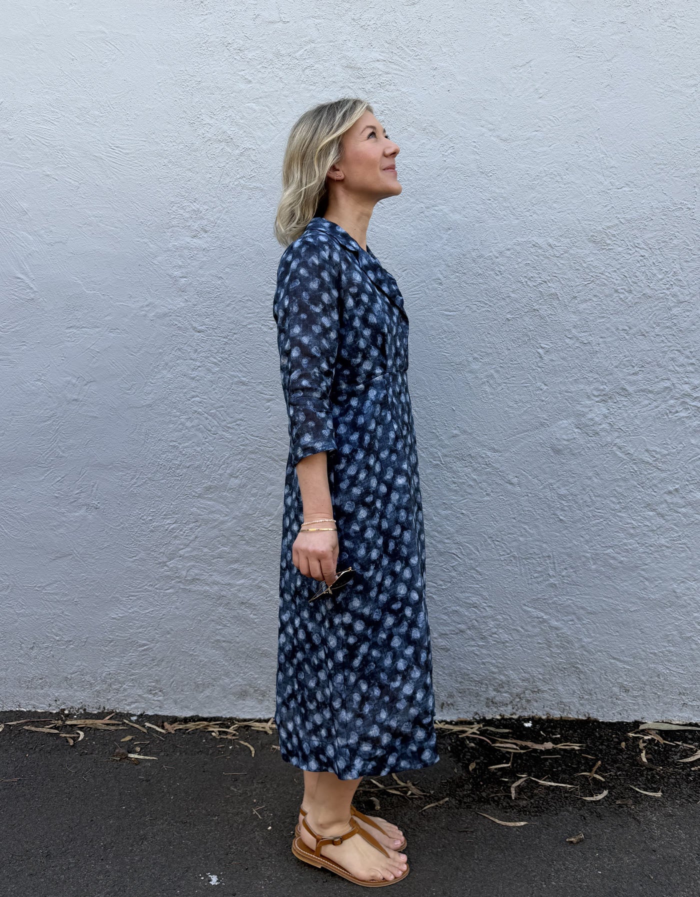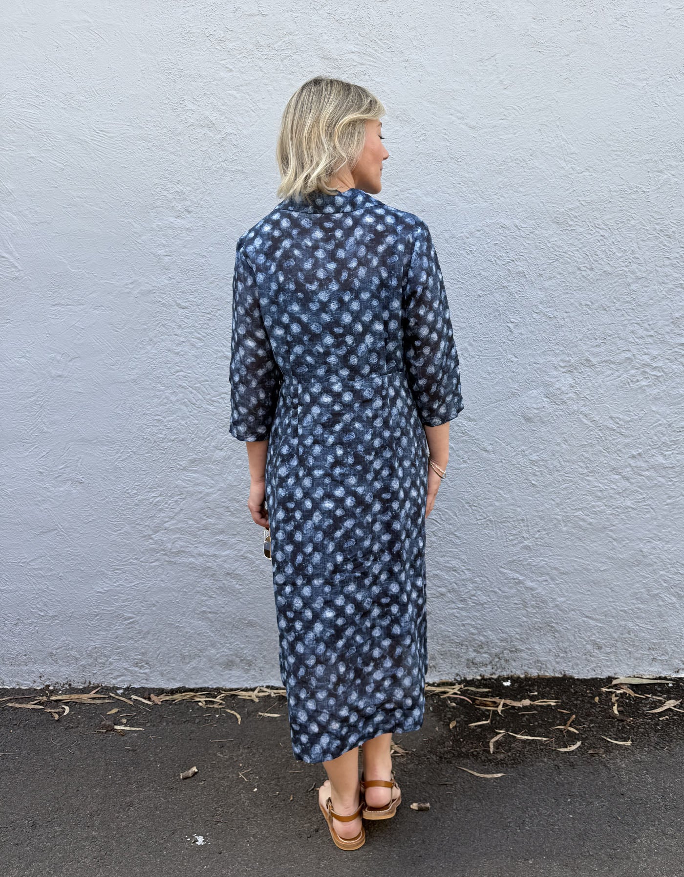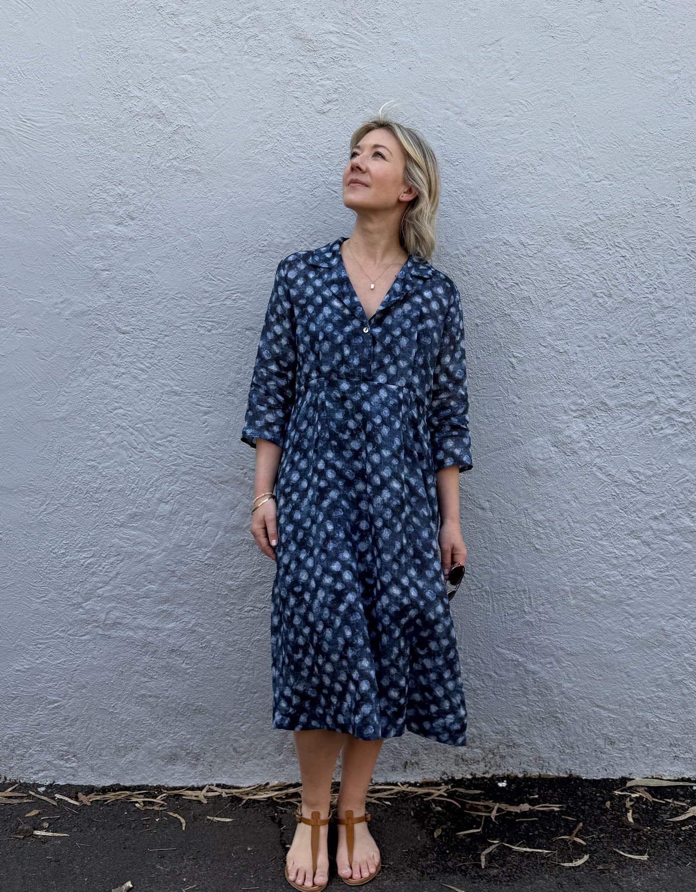 Jiva 50's Dress - Blue Square/ Beige Spot Print - Ramie