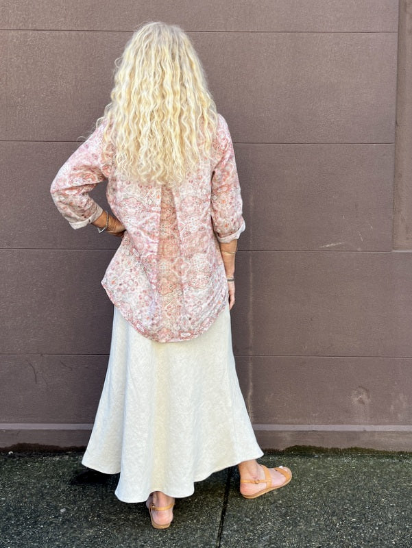 Beautiful Maria is an A-line bodice shirt with 3/4 sleeve length. Back detail is an inverted pleat to add shape. Lovely worn back with our wide or narrow Mimi leg pants, Bias cut Prudence skirts or linen slip dresses.