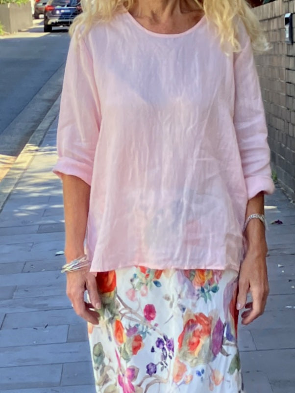 Beautiful Maria is an A-line bodice shirt with 3/4 sleeve length. Back detail is an inverted pleat to add shape. Lovely worn back with our wide or narrow Mimi leg pants, Bias cut Prudence skirts or linen slip dresses.