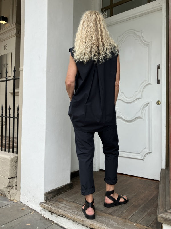 Sleeveless Maria is an A-line bodice shirt. Back detail is an inverted pleat to add shape. Lovely worn back with our wide leg or narrow leg Mimi pant, linen slips or Prudence skirts.