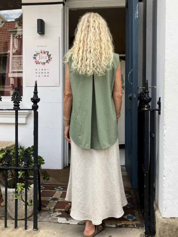 Sleeveless Maria is an A-line bodice shirt. Back detail is an inverted pleat to add shape. Lovely worn back with our wide leg or narrow leg Mimi pant, linen slips or Prudence skirts.