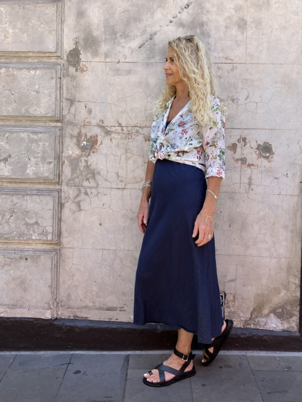 Our new bias cut shoestring linen slip dress is gorgeous on its own. A perfect summer slip to layer with our fitted shirts or Maria tops.
