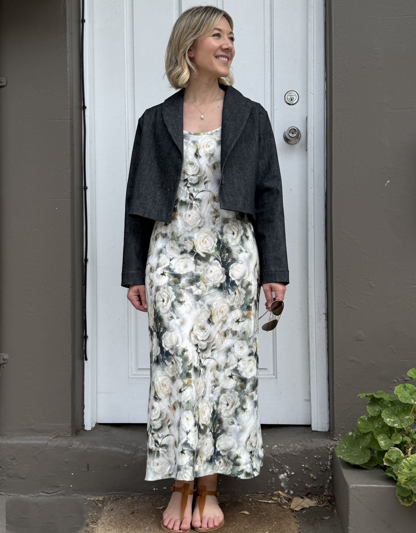 Gorgeous Catherine is an unlined jacket with shawl collar, one shell button. Wear back over our bias cut a slip dress.