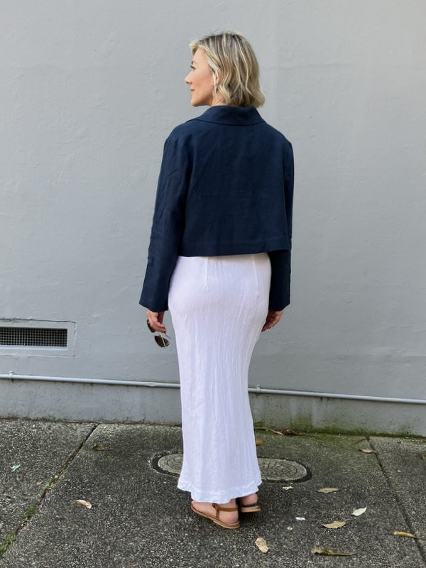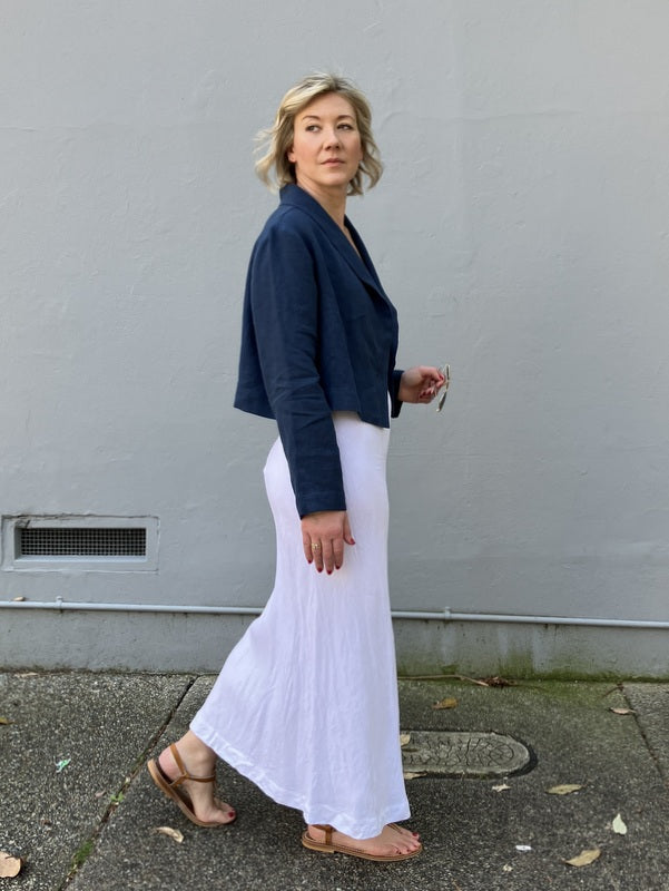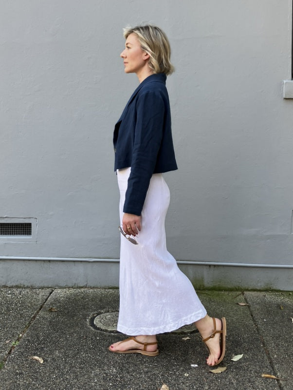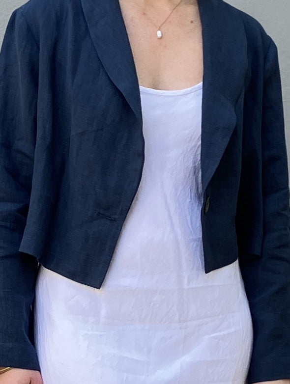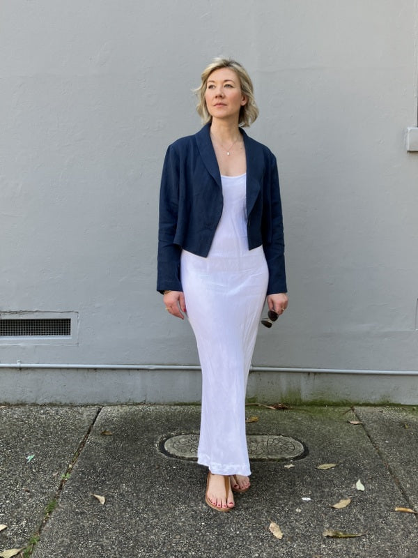 Gorgeous Catherine is an unlined jacket with shawl collar, one shell button. Wear back over our bias cut slip dress.