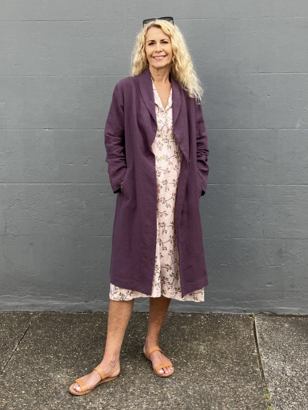 Gorgeous Catherine is an unlined coat with shawl collar, one shell button and jet pockets. Wear back over our gorgeous wide or narrow leg Mimi pant, 50s dresses or linen Prudence skirts.