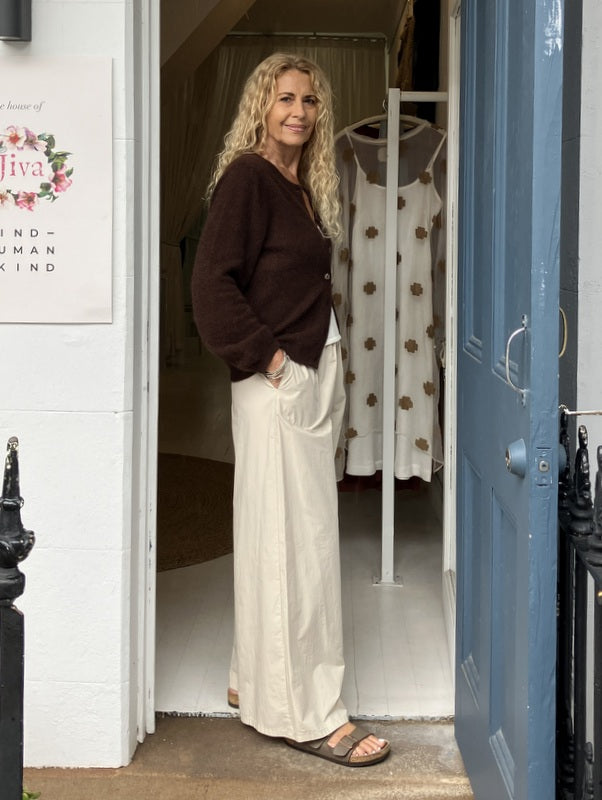 Sweet Jane is a button thru cardigan made from luxe cashmere/silk. Gorgeous back with pants, skirts or over slips. Timeless and chic. A perfect travel partner for all seasons.