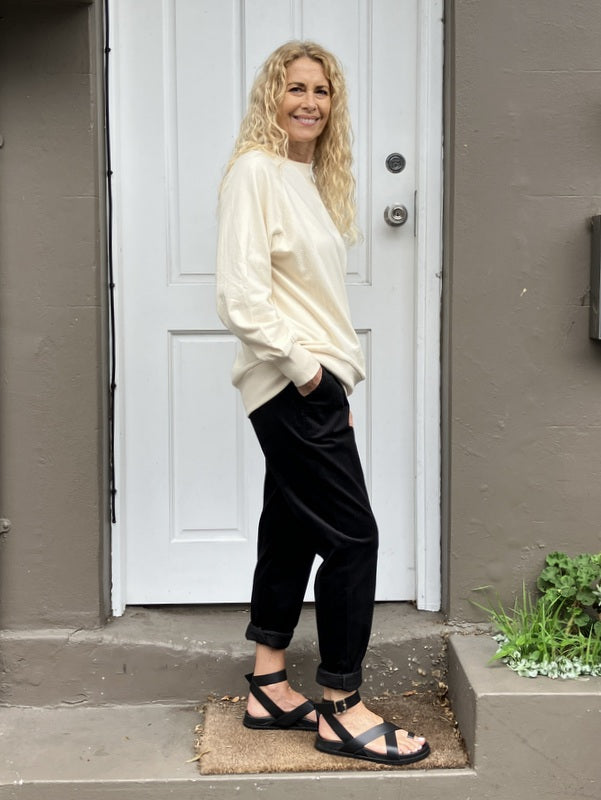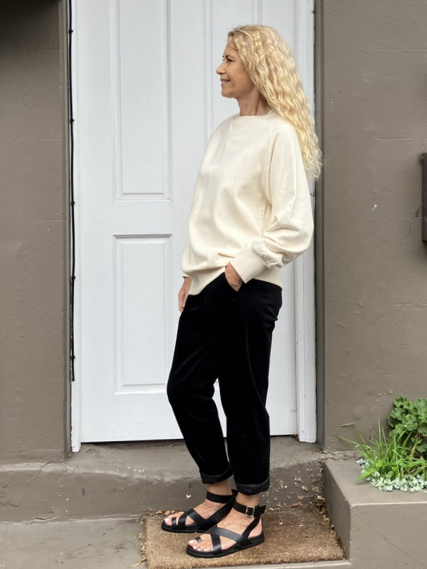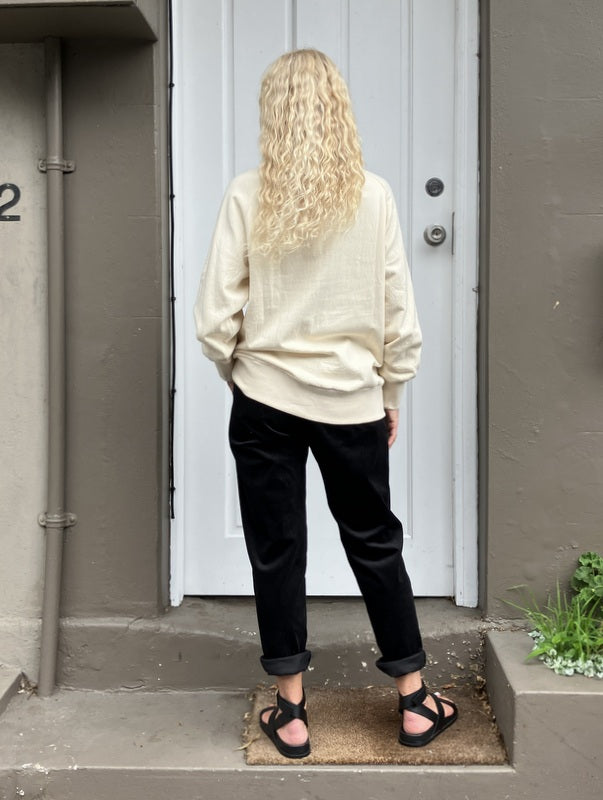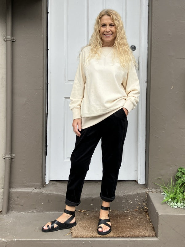 Misty is an oversized cotton fleece sweat top. Great back with pants or skirts. Perfect travel partner. Sizeup for a relaxed look.