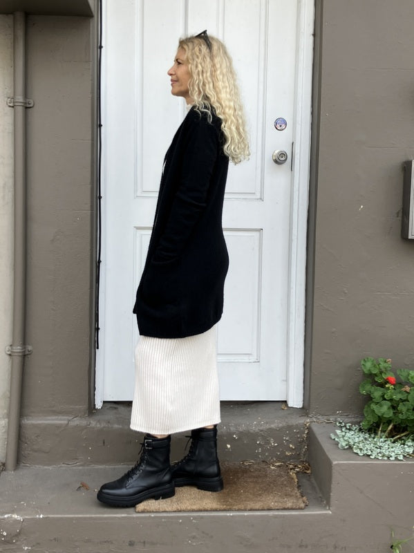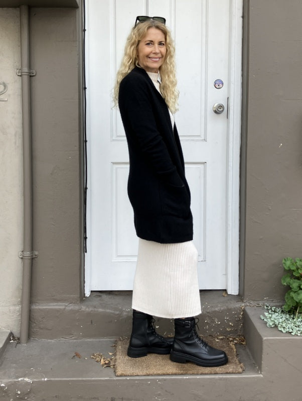 Gorgeous Virginia is a luxe cashmere cardigan, pockets, shawl collar. Super cosy. perfect travel partner.