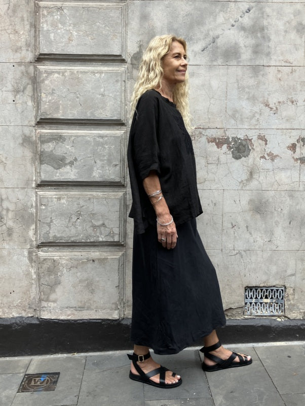 An relaxed easy wear hand loomed linen top with hand embroidery.
