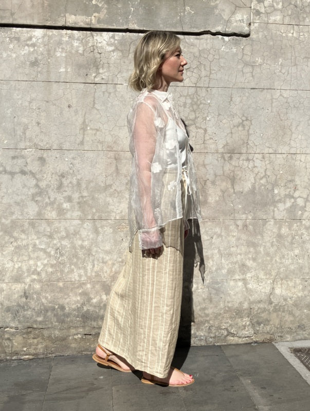 Loom Lifestyle shirt in handwoven silk organza with pale pale pink jamdani flowers.