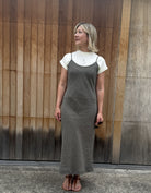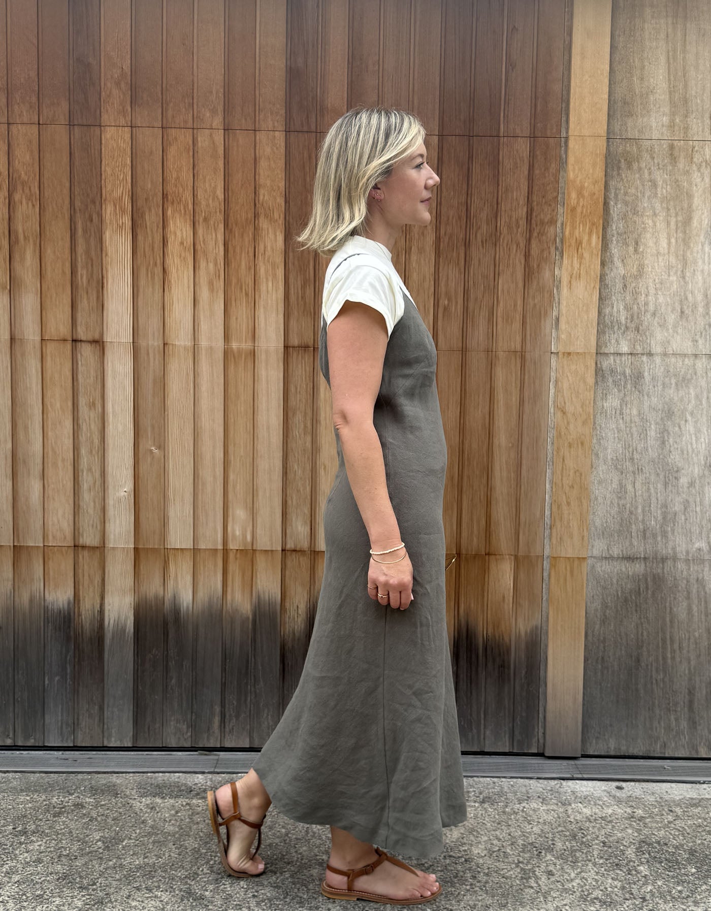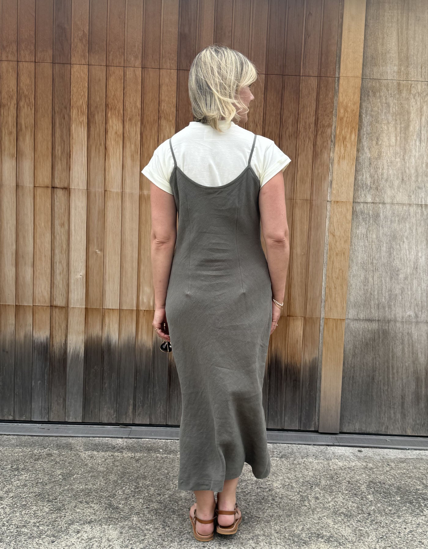 Our new bias cut shoestring linen slip dress is gorgeous on its own. A perfect summer slip to layer with our fitted shirts or Maria tops.
