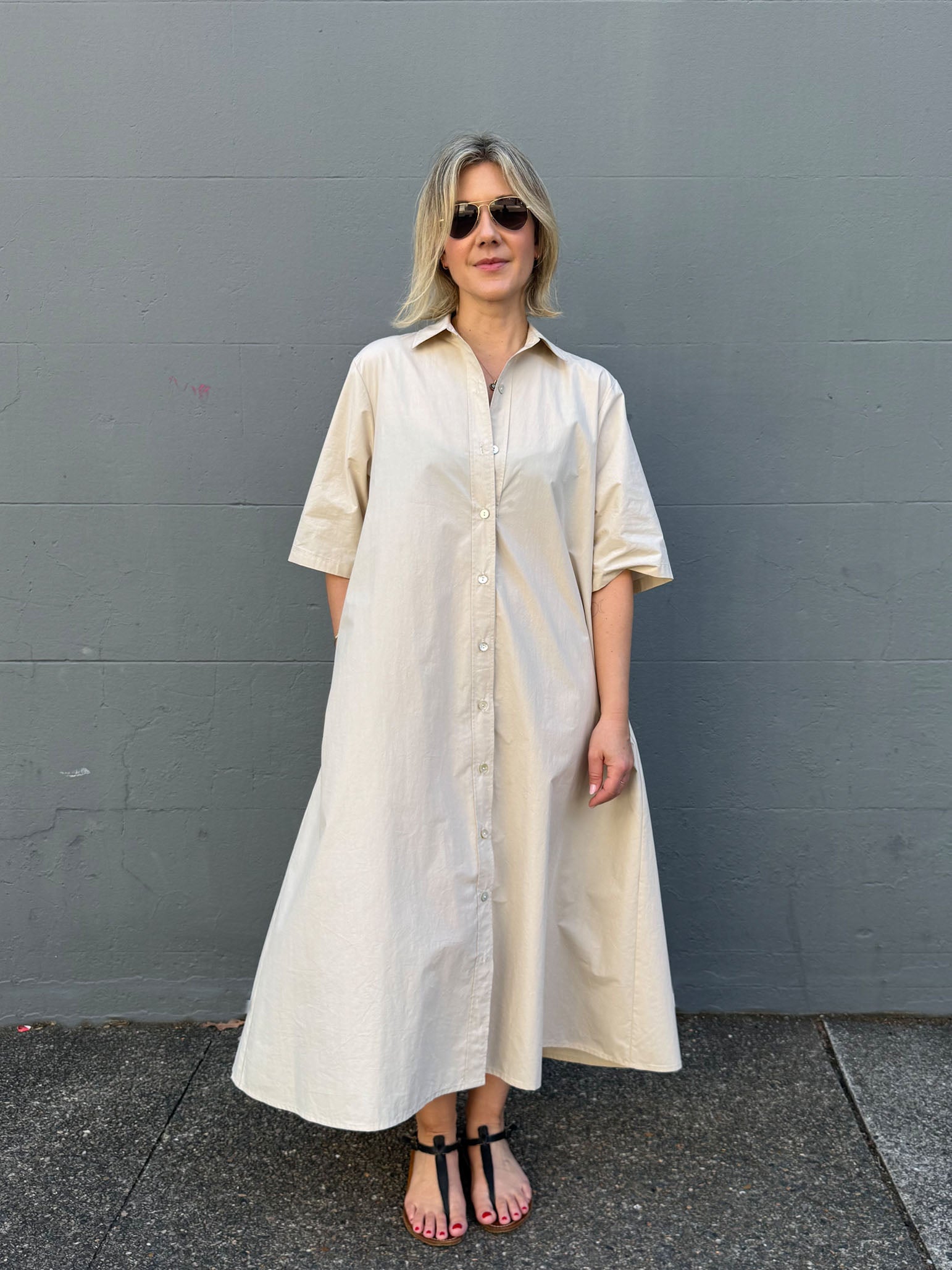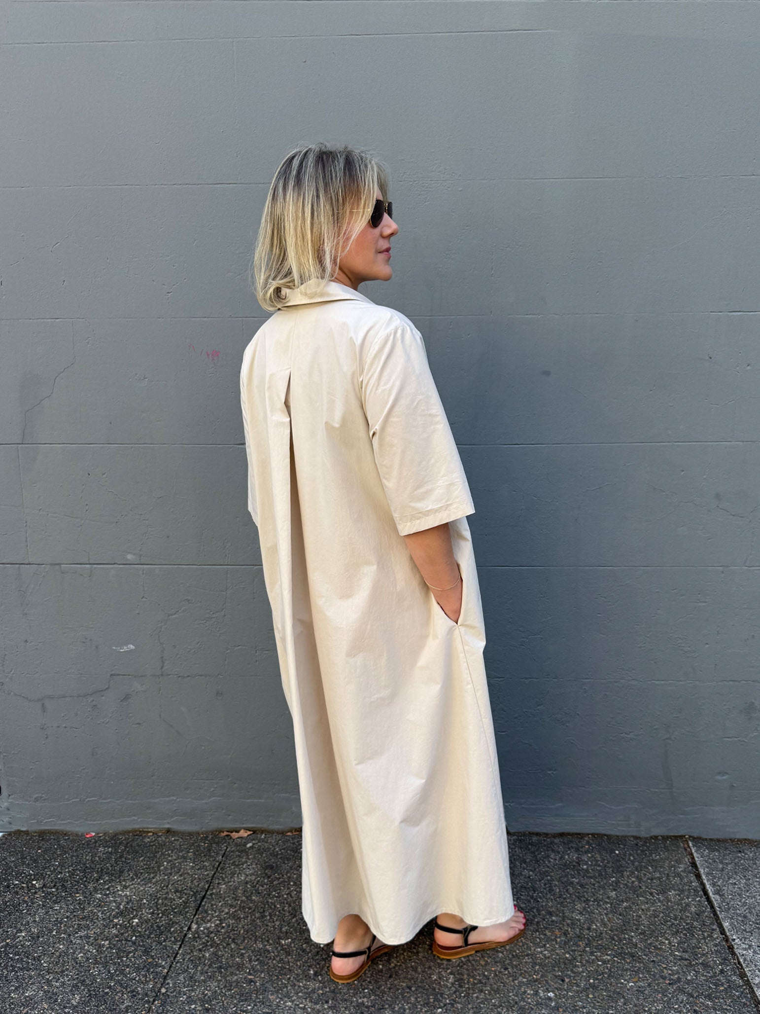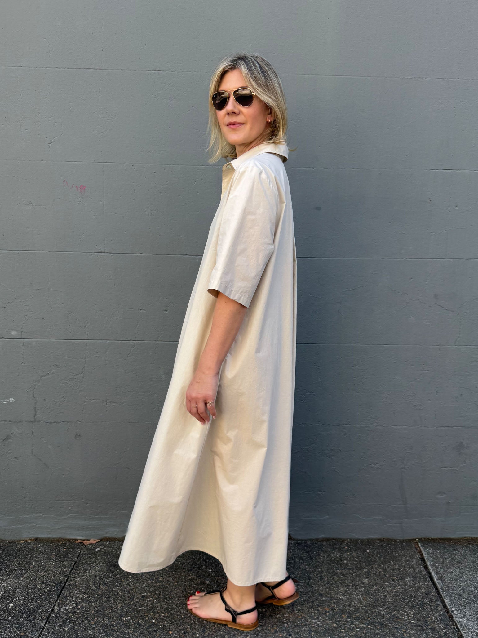 The sophisticated Olivia dress is an A-line button front shirt dress with an elbow length sleeve. The back detail is an inverted pleat to add shape, and has the versatility to wear as a dress or open lightweight coat.