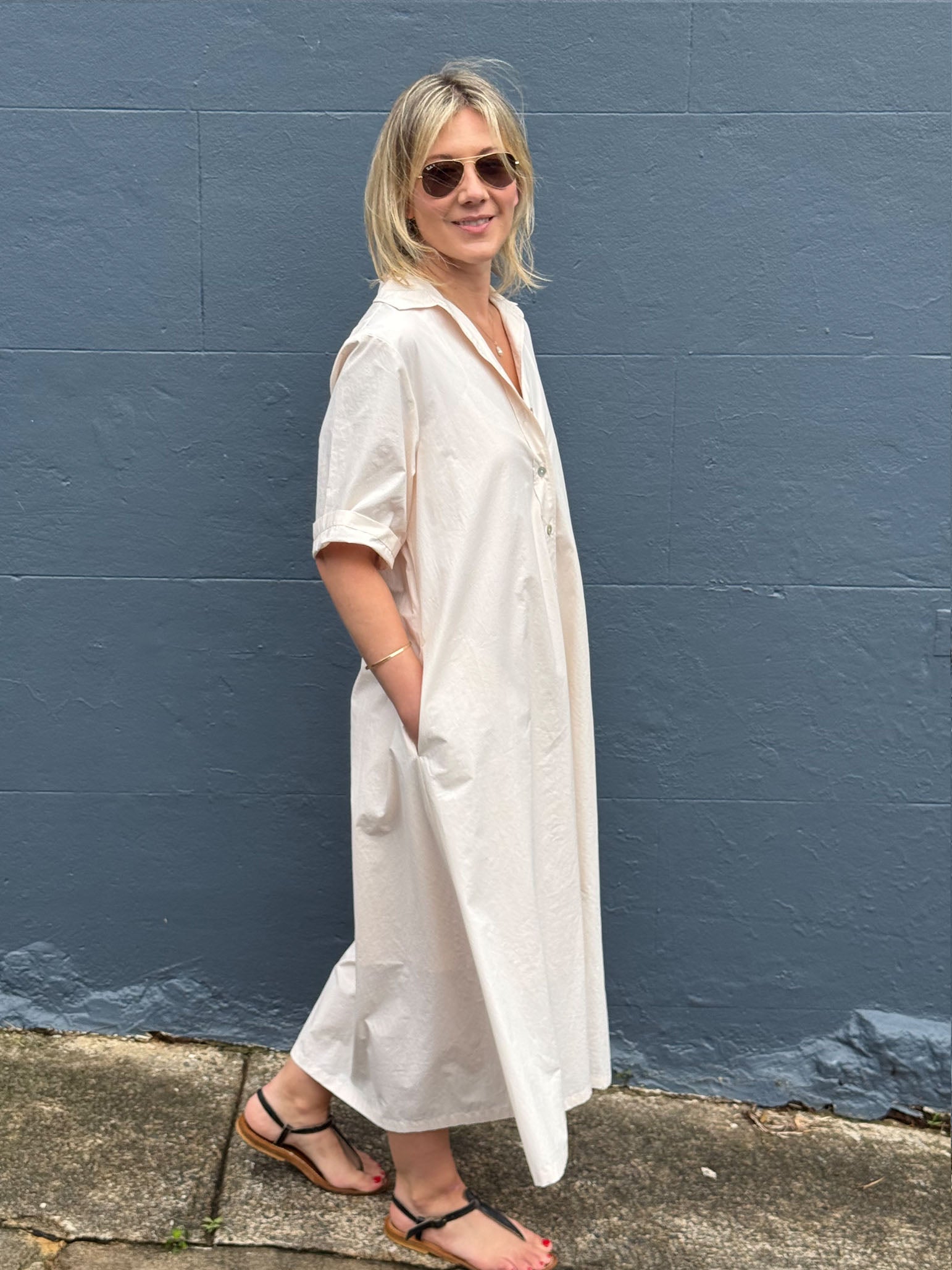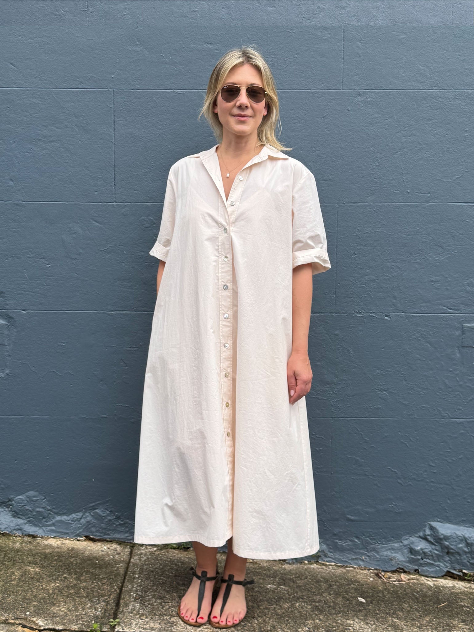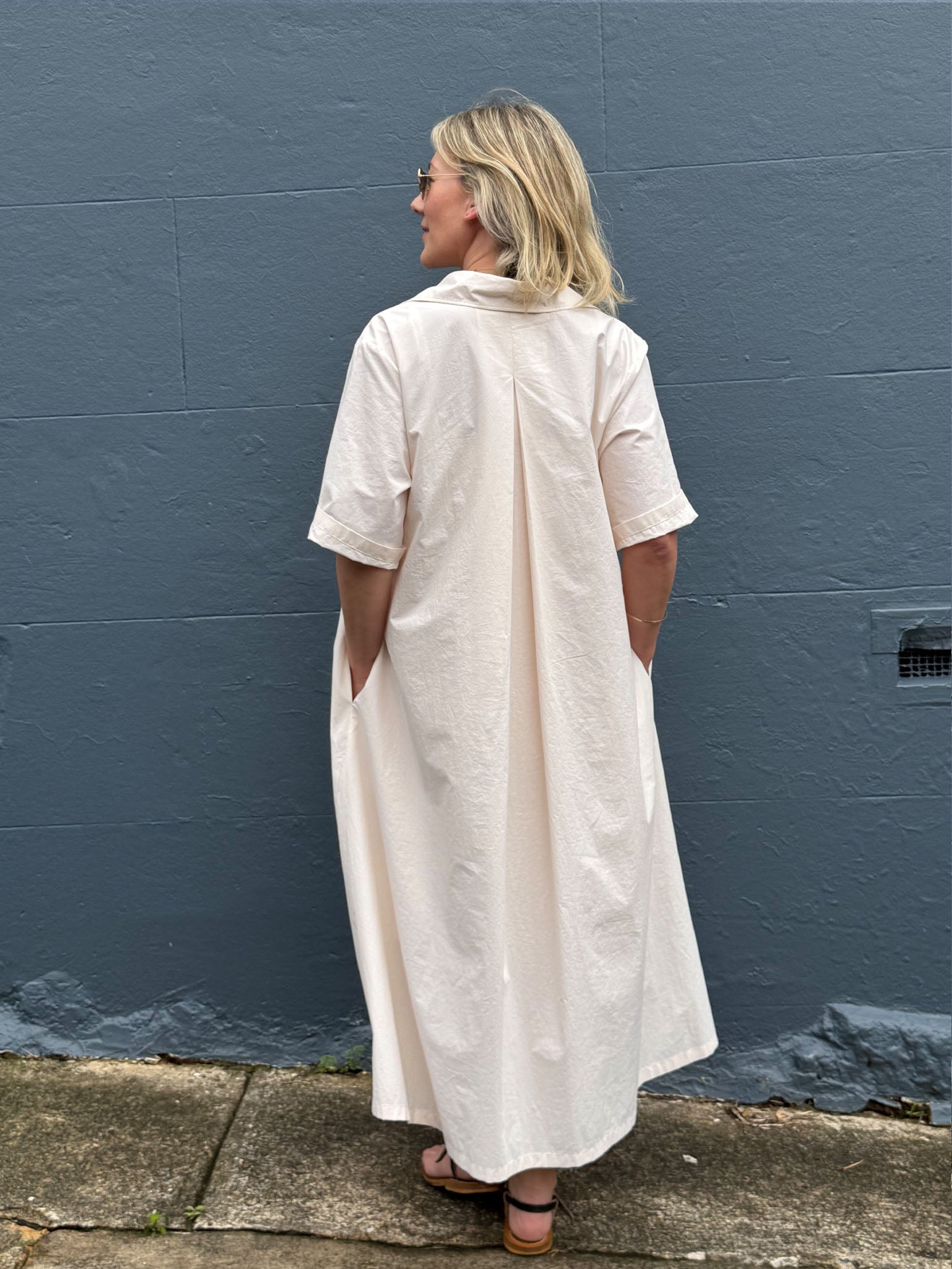 The sophisticated Olivia dress is an A-line button front shirt dress with an elbow length sleeve. The back detail is an inverted pleat to add shape, and has the versatility to wear as a dress or open lightweight coat.