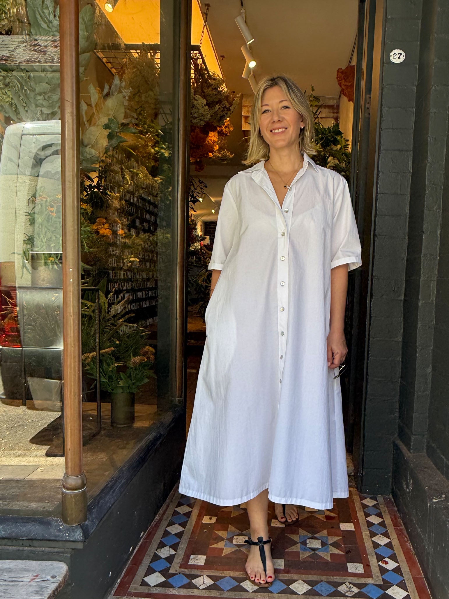 The sophisticated Olivia dress is an A-line button front shirt dress with an elbow length sleeve. The back detail is an inverted pleat to add shape, and has the versatility to wear as a dress or open lightweight coat.