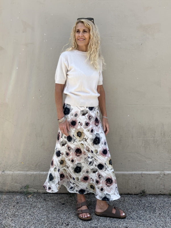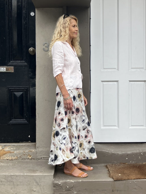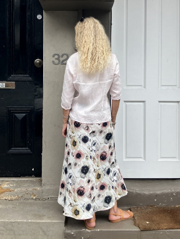 Jiva Midi Linen Prudence Skirt- Camellia Print - White Base