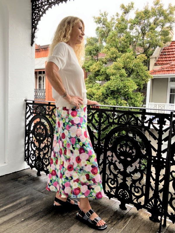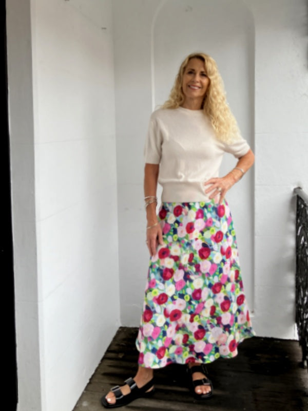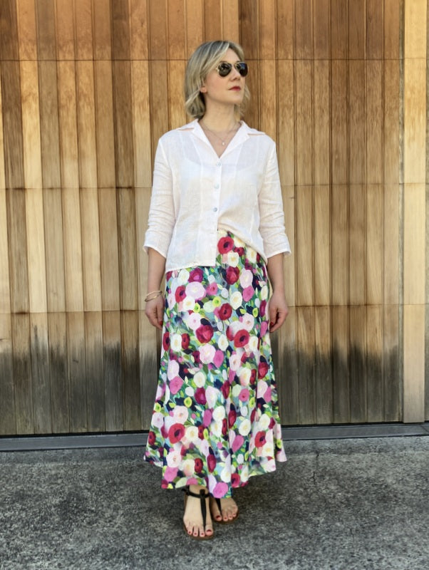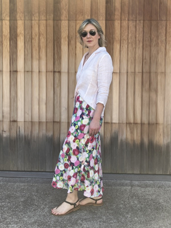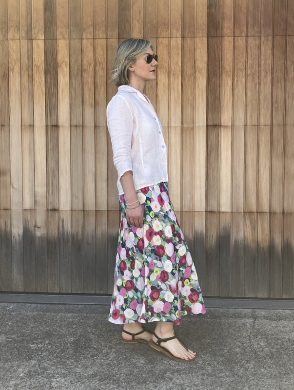 Jiva Midi Linen Prudence Skirt- Camellia Print - White Base