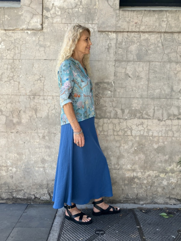 Jiva Midi Linen Prudence Skirt- Blue Moroccan Tile Print
