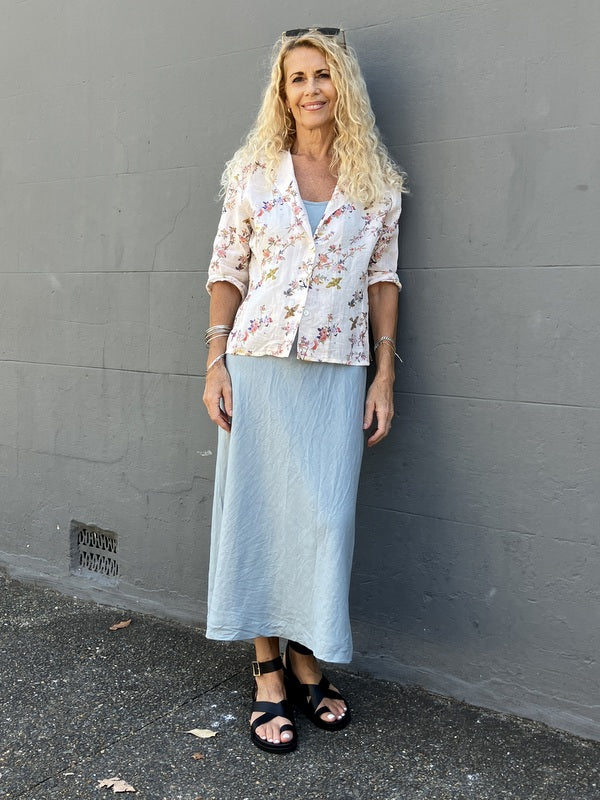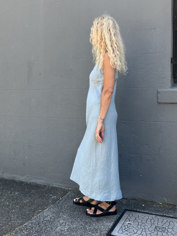 Our new bias cut shoestring linen slip dress is gorgeous on its own. A perfect summer slip to layer with our fitted shirts or Maria tops.
