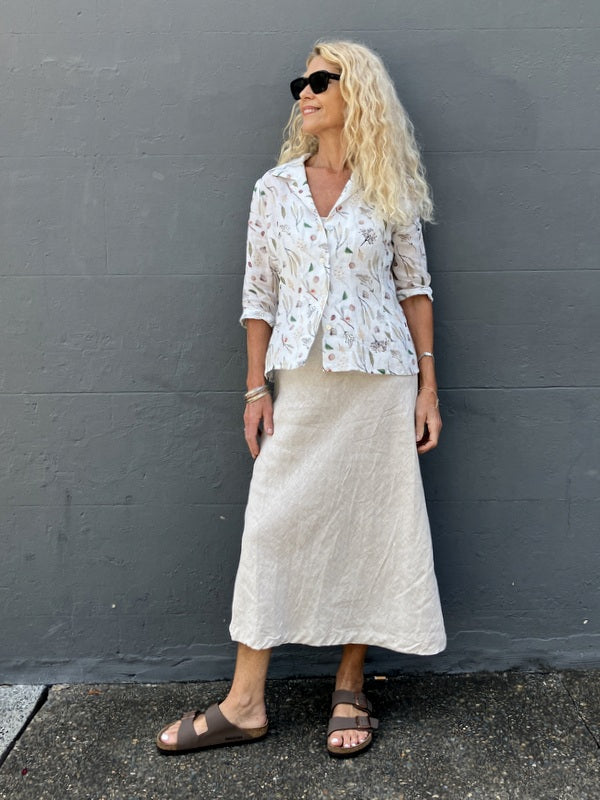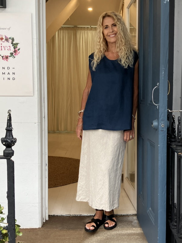 Our new bias cut shoestring linen slip dress is gorgeous on its own. A perfect summer slip to layer with our fitted shirts or Maria tops.