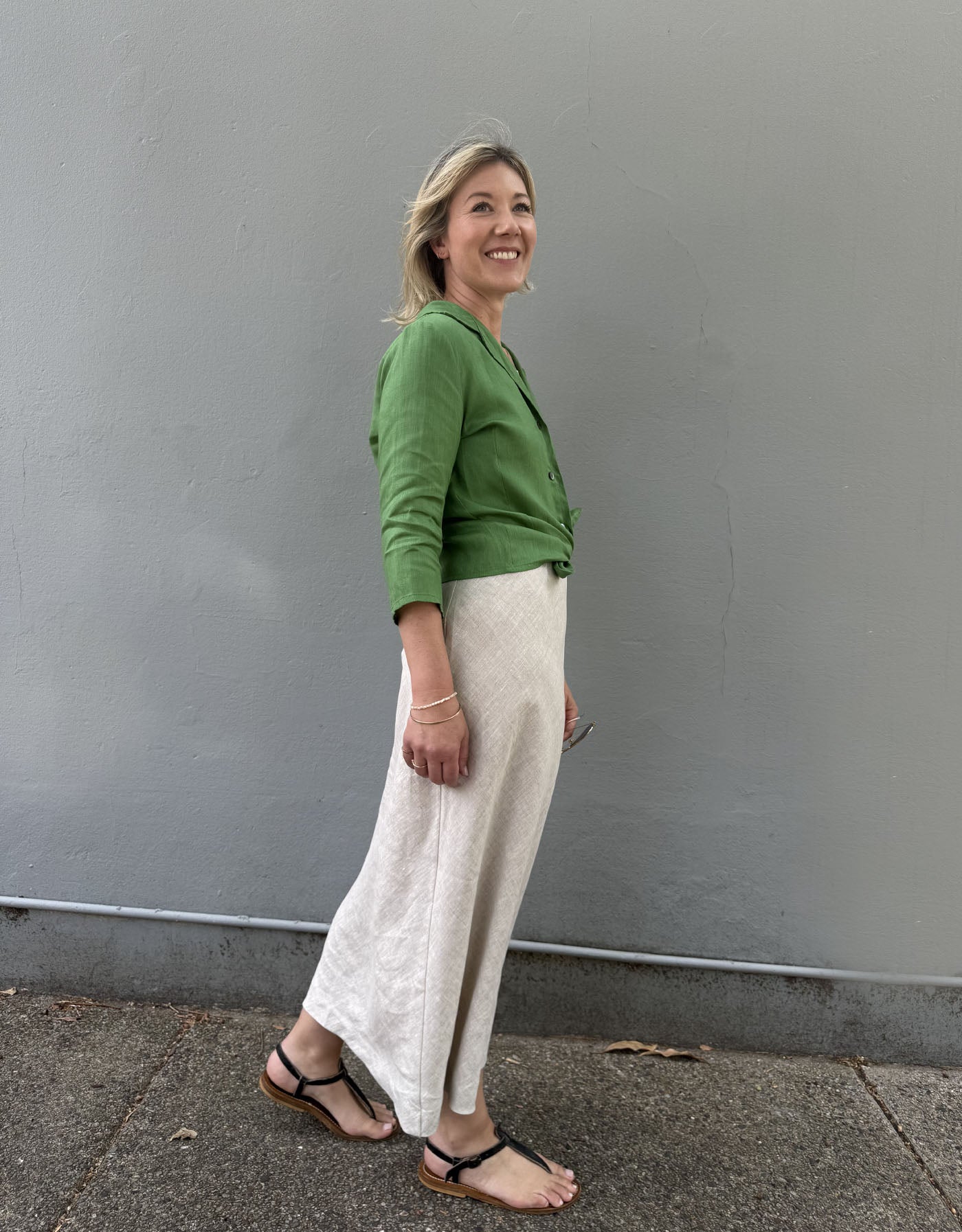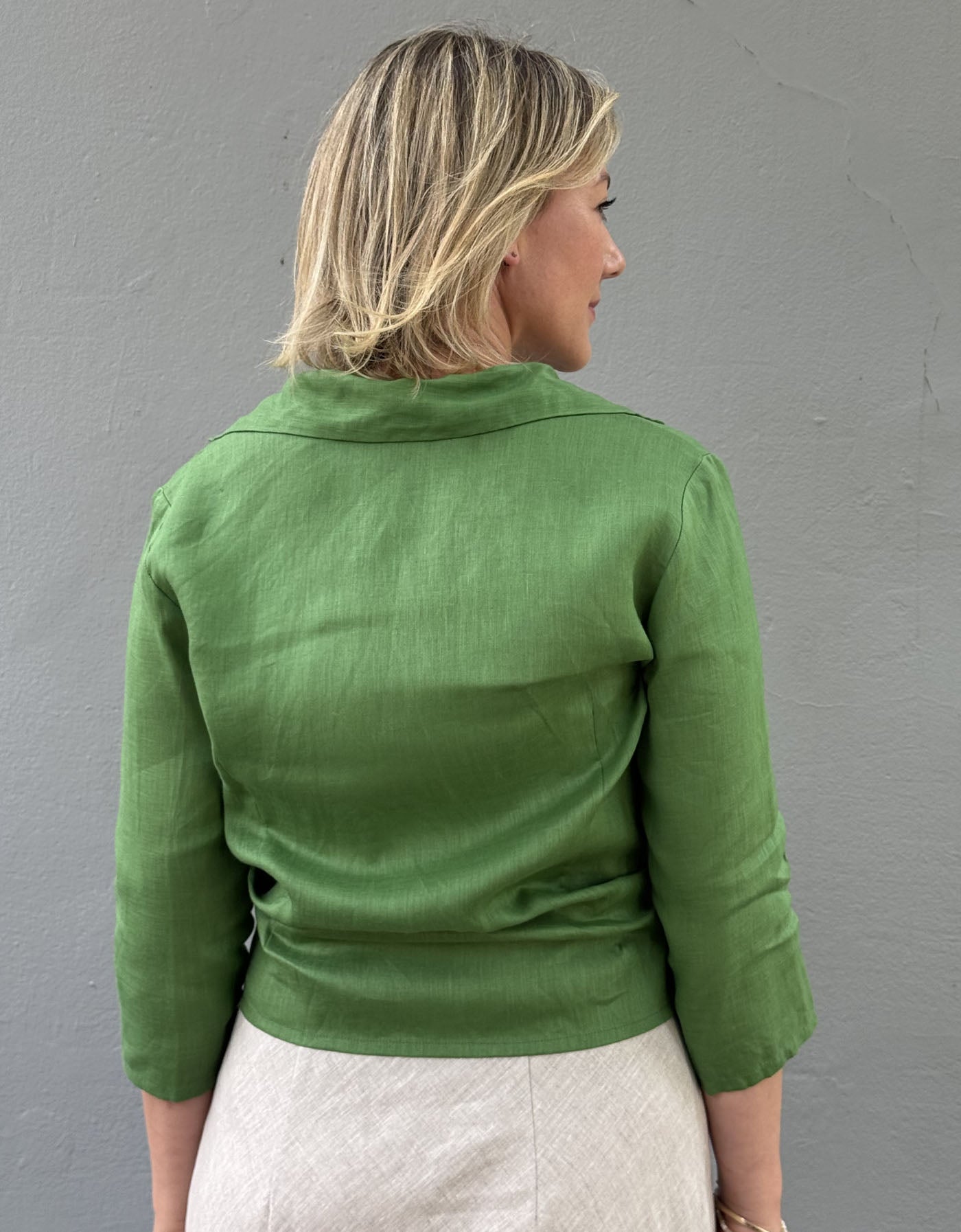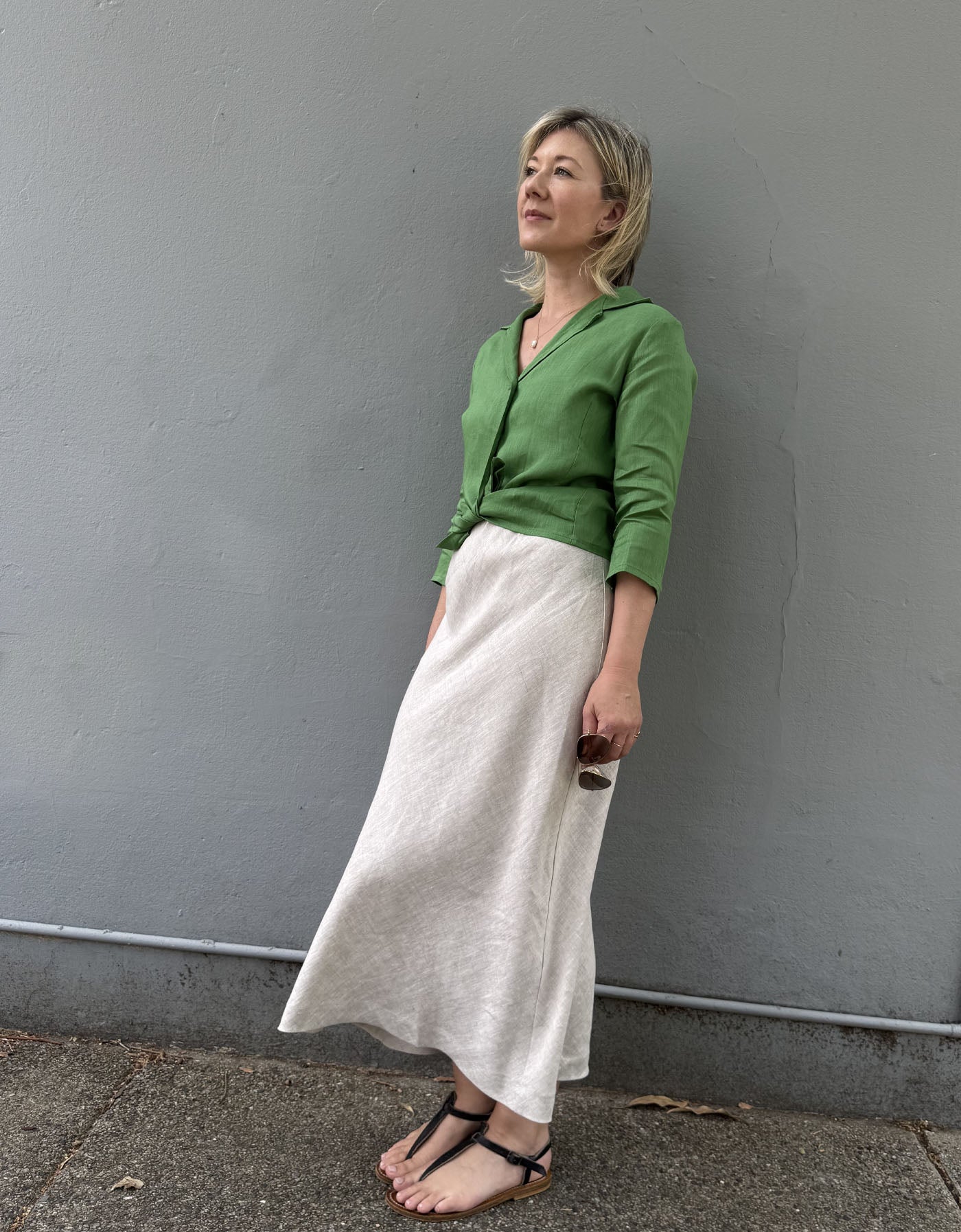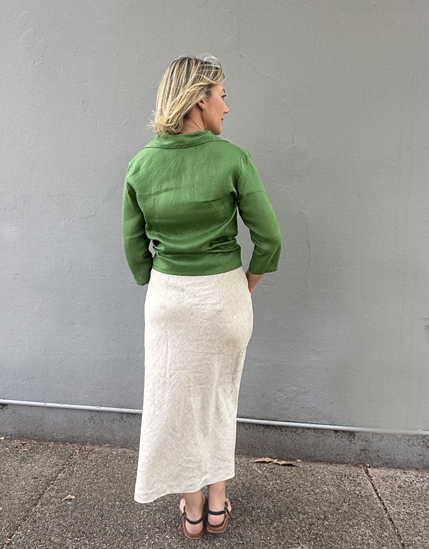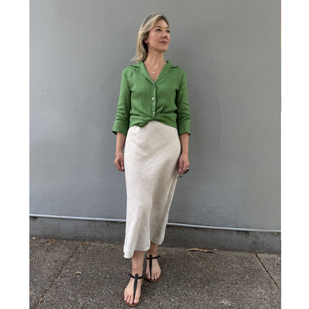 This fabulous fitted shirt is an easy fit button through shirt. Great back with our wide leg or narrow leg Mimi pants or our linen Prudence skirts. Can be worn as a jacket over our linen bias cut slips.