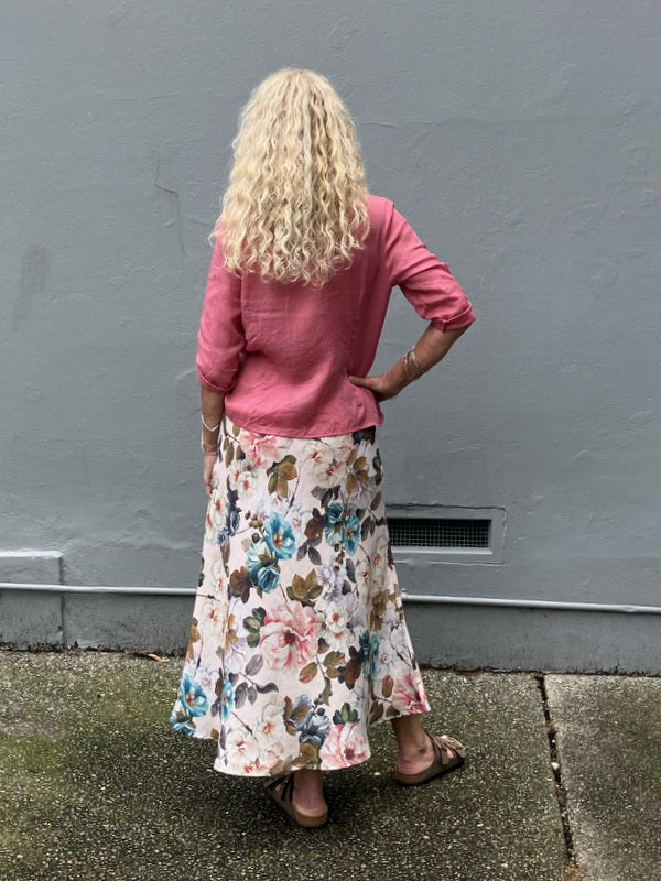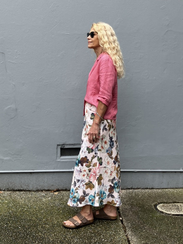 This fabulous fitted shirt is an easy fit button through shirt. Great back with our wide leg or narrow leg Mimi pants or our linen Prudence skirts. Can be worn as a jacket over our linen bias cut slips.