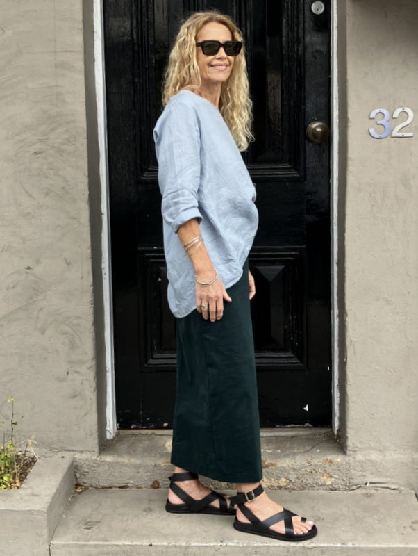 Beautiful Maria is an A-line bodice shirt with 3/4 sleeve length. Back detail is an inverted pleat to add shape. Lovely worn back with our wide or narrow Mimi leg pants, Bias cut Prudence skirts, Sophia cord skirts or linen slip dresses.