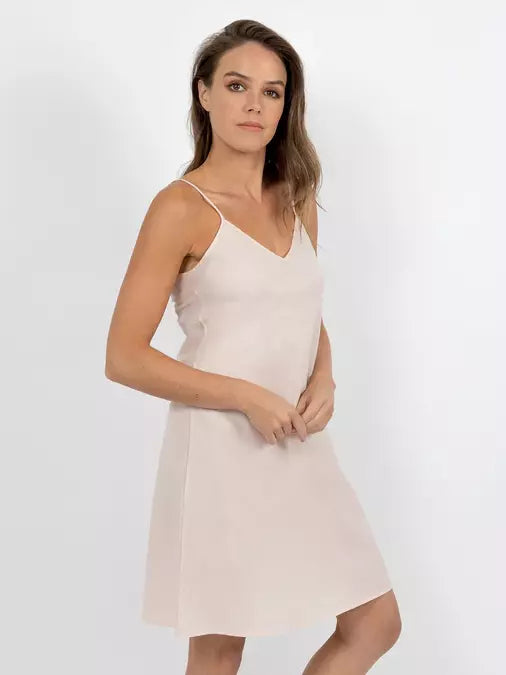 Reversible full slip, "V" neck one way and scoop neck the other. Adjustable strap, simple lines. Available in white, black and nude. Length 79cm