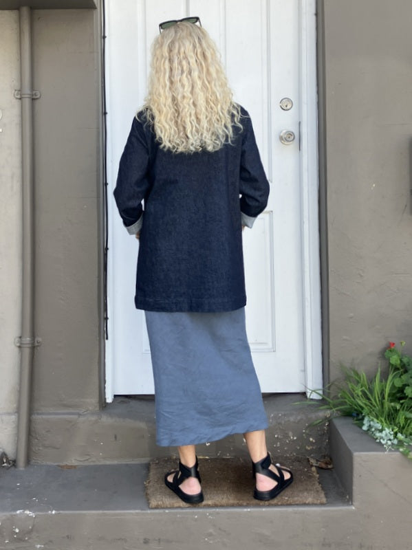Catherine is an unlined jacket with shawl collar, one shell button and jet pockets. Layer over a bias slip dress, pants or skirt.