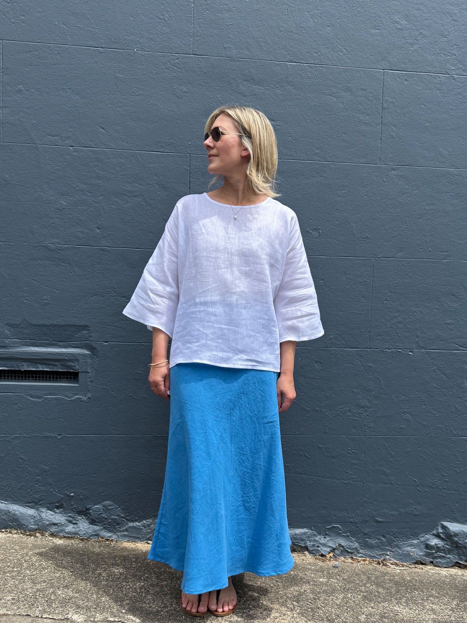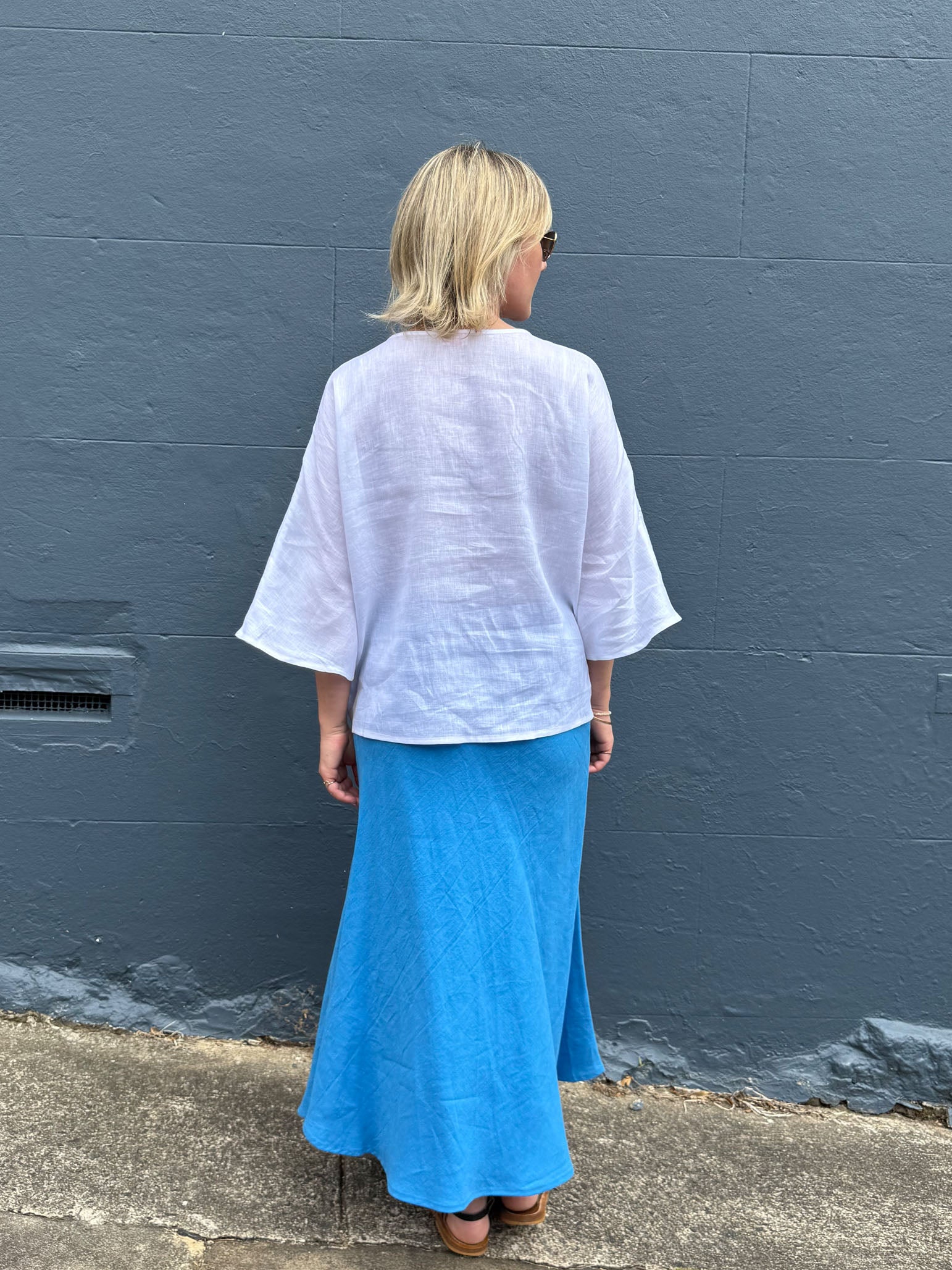 The Helena Shirt has a relaxed hip-length bodice shirt with a flared 3/4 sleeve length to add a subtle detail. Lovely worn back with our wide or narrow Mimi leg pants, Bias cut Prudence skirts or linen slip dresses.